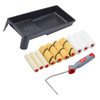 This handy pack of 10 rollers and frame covers virtually all paint types and surfaces you'll need a mini roller for. Suitable for emulsion and masonry paints on smooth and semi-smooth surfaces such as plaster, drywall, ceilings and brick, the medium pile woven tiger stripe roller picks up plenty of paint without over-loading, giving even application and excellent coverage. Ideal for applying water- and solvent-based gloss, satin, undercoat and primer on smooth wood and metal, the high density foam roller is made using open-cell foam which absorbs paint, releasing it gradually through each roll, giving even surface coverage and a superb finish with no roller texture. With a 5mm short pile that applies the optimum film thickness to achieve the right sheen level, the lint-free synthetic mohair rollers are ideal for applying water- and solvent-based gloss and satin paints on wood and metal, as well as low viscosity woodstains on smooth planed timber. The set is completed with a 26cm long push fit mini roller frame with an ergonomic soft grip handle for comfortable working.